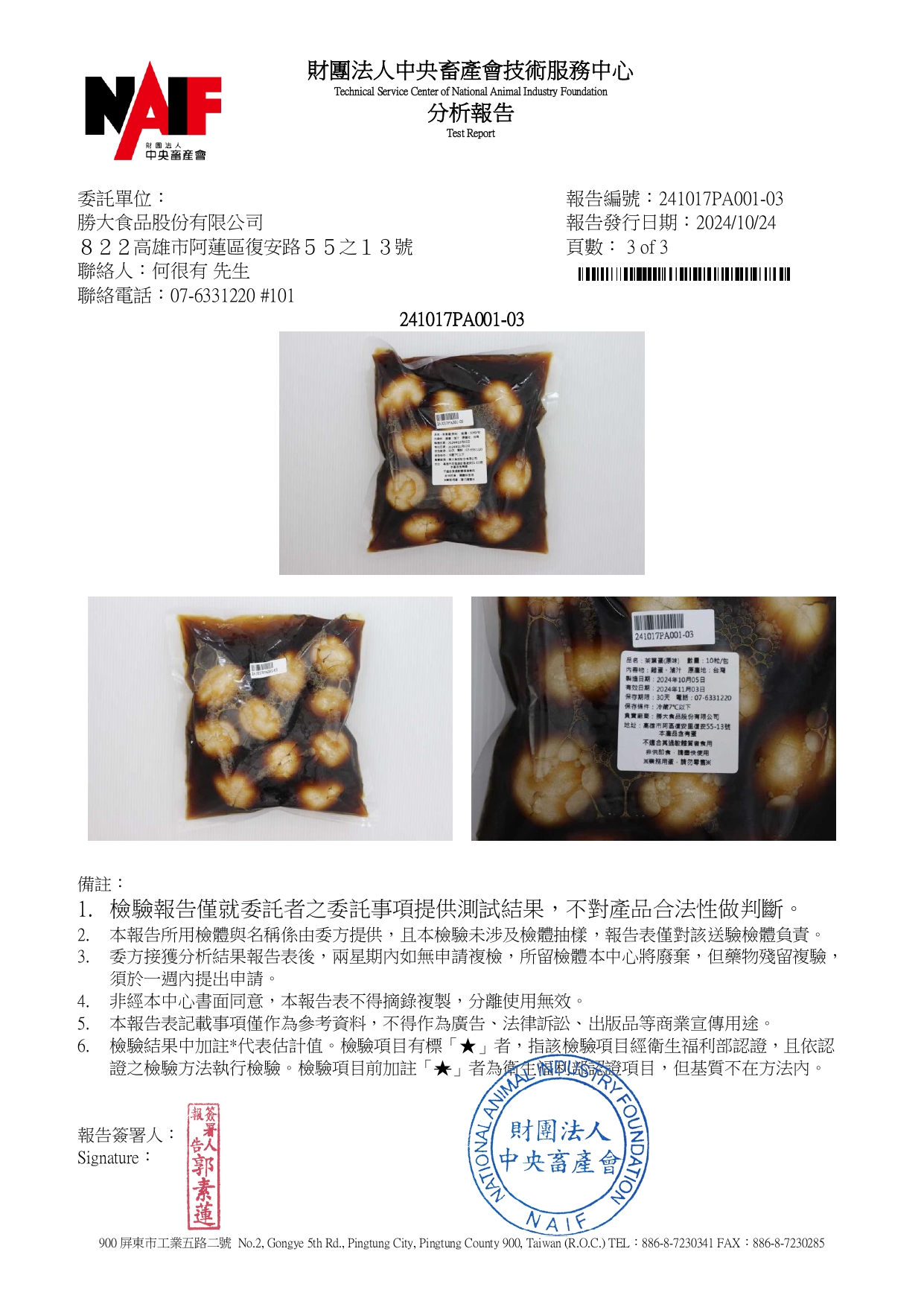 2024年第四季「茶葉蛋(原味)檢驗報告」